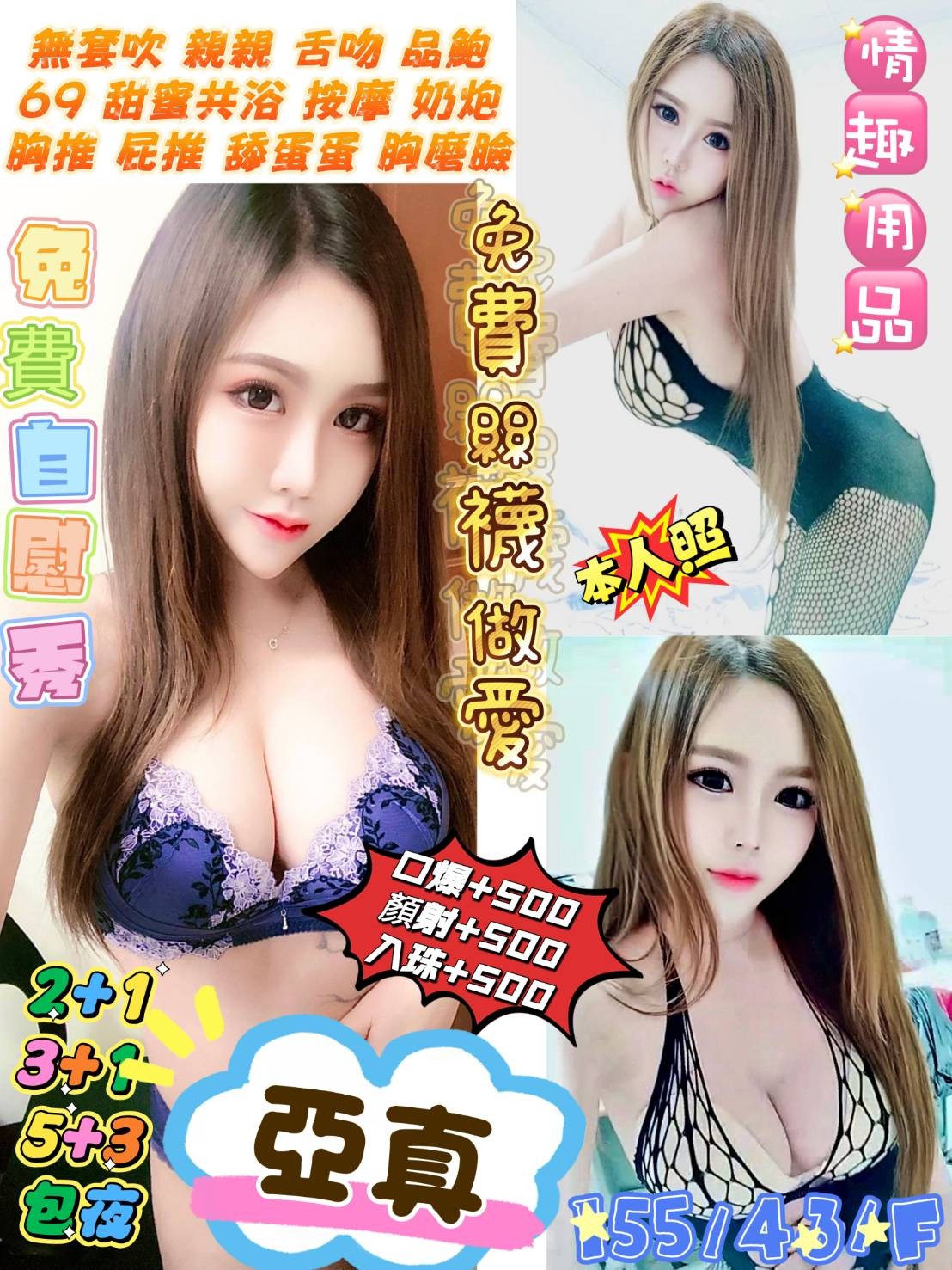 👍項目:無套吹/親親/舌吻/品鮑/69/甜蜜共浴/按摩/奶炮/胸推/屁推/舔蛋蛋/胸磨臉/免費自慰秀/情趣用品