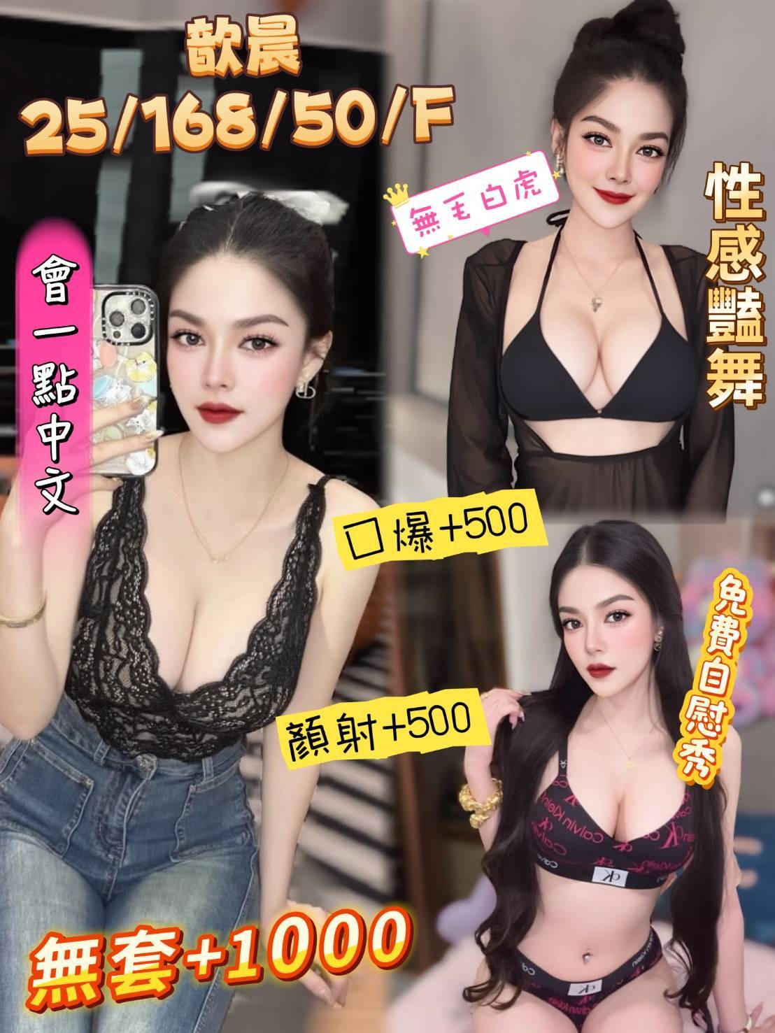 (泰)歆晨25/168/50/F 會一點中文,乾淨白虎,無套吹,共浴,親嘴,舌吻,品鮑,六九,按摩,奶炮,舔蛋,豔舞,胸磨臉,自慰秀,絲襪誘惑,情趣用品