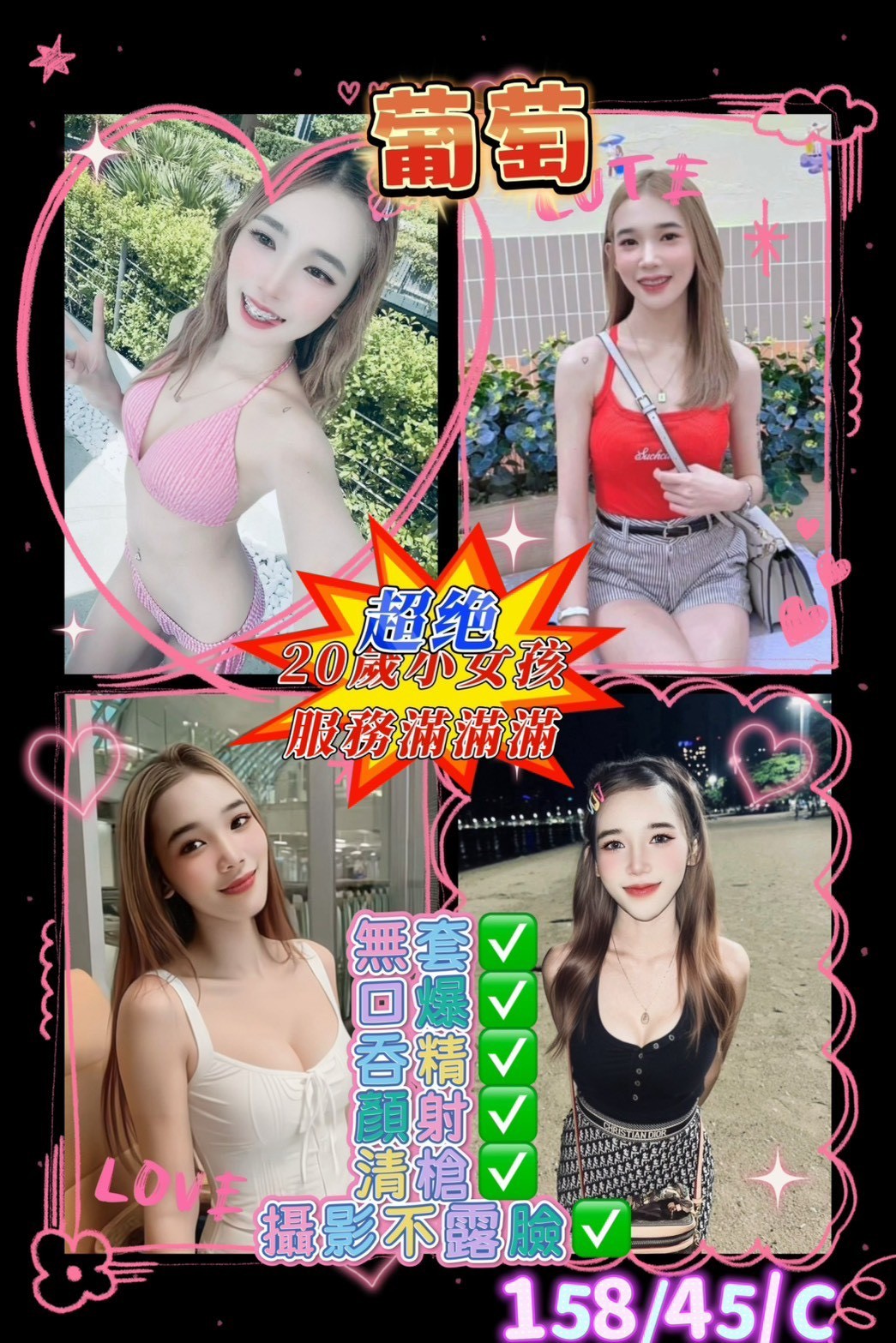 💗服務:無套吹 深喉嚨 共浴 親嘴 舔蛋 屁推 足交 品鮑 69 奶炮 水中蕭 胸推 按摩 可配合絲襪 情趣用品