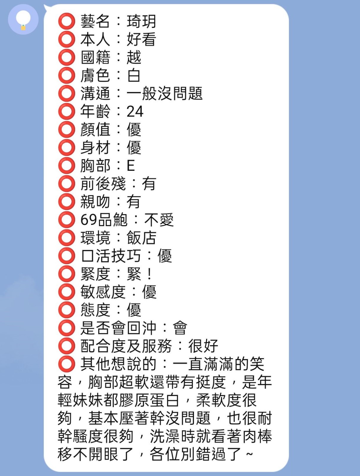 腰力很好 口技不錯 下面很敏感~   Review by 董**