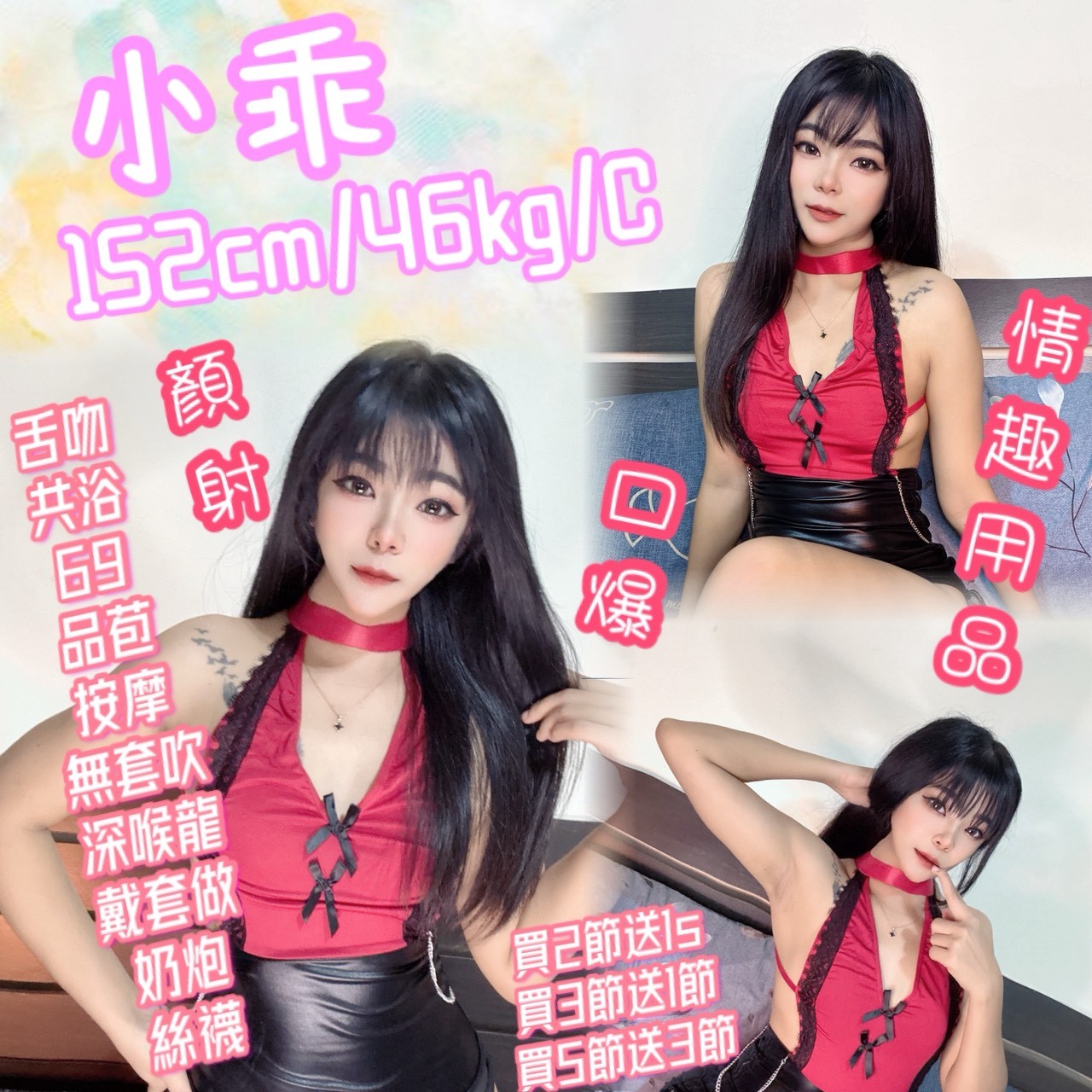 舌吻(視口腔衛生)/共浴/品鮑/69/按摩/奶炮/深喉嚨/無套吹/絲襪(客自備)/毒龍