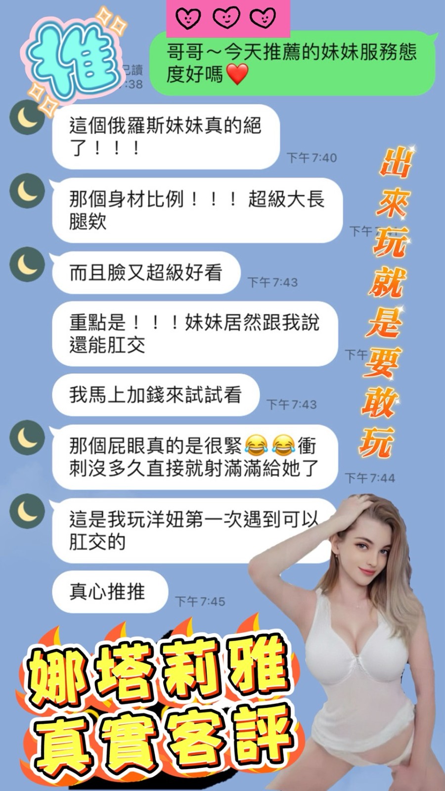 主打➡🇷🇺俄羅斯來台交換學生線上知名內衣小模,渾圓翹臀奔放性愛。態度滿分不打槍,究極美尻,真人芭比女神,難得的勻稱修長身材,回客不斷,熱銷紅牌。