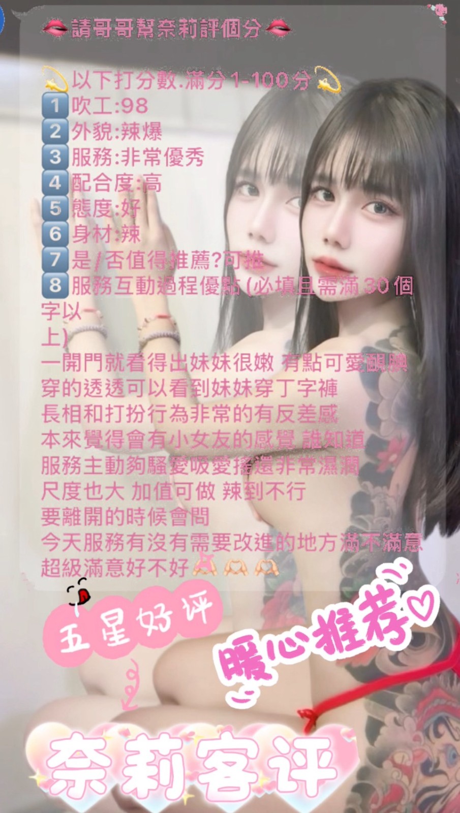 👍項目:無套吹/共浴/親嘴/舌吻/品鮑/奶炮/水中蕭/胸推/屁推/按摩