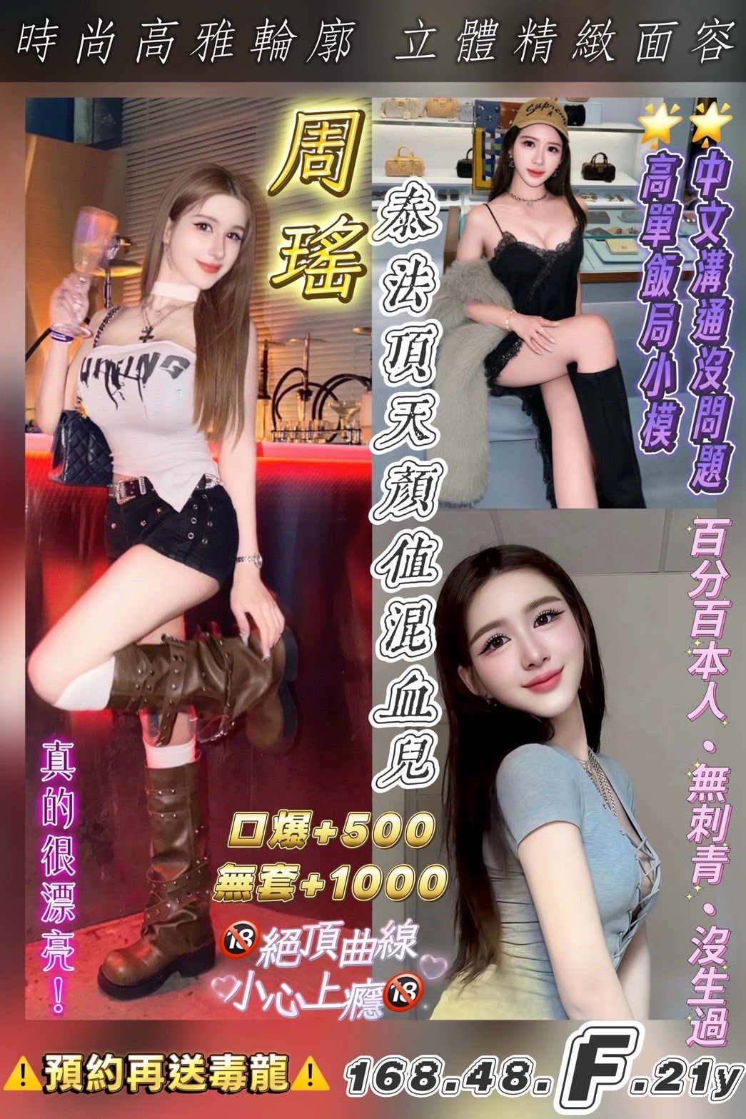 天啊‼️高級泰法混血女孩,超高水準外型,時尚超會打扮、聽話敏感超會噴水,每每開班屢創佳績,中午溝通零障礙,口技一流,立體精緻面容深得人心👍究極三通配合度超高,趕快把握、預約從速啊啊啊啊!